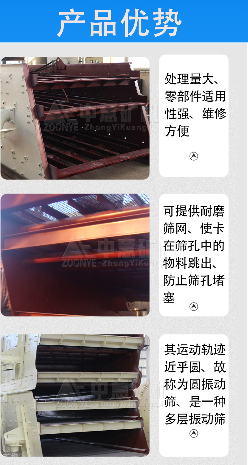 中意礦機(jī)圓振動(dòng)篩是一種做圓形振動(dòng)、多層數(shù)、新型振動(dòng)篩。圓振動(dòng)篩采用筒體式偏心軸激振器及偏塊調(diào)節(jié)振幅,物料篩淌線(xiàn)長(zhǎng),篩分規(guī)格多,具有結(jié)構(gòu)可靠、激振力強(qiáng)、篩分效率高、振動(dòng)噪音小、堅(jiān)固耐用、維修方便、使用等特點(diǎn),該振動(dòng)篩廣泛應(yīng)用于礦山、建材、交通、能源、化工等行業(yè)的產(chǎn)品分級(jí)。