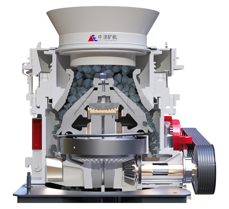 彈簧圓錐破碎機其結構主要有機架、水平軸、動錐體、平衡輪、偏心套、上破碎壁(固定錐)、下破碎壁(動錐)、液力偶合器、潤滑系統、液壓系統、控制系統等幾部分組成。彈簧圓錐破碎機適用于破碎中等以上硬度的各種礦石和巖石,具有結構可靠,生產效率高,調整方便,使用經濟等特點;并且彈簧保險系統是過載保護裝置,可使異物鐵塊通過破碎腔而不危害機器,采用干油或水兩種密封形式,使石粉與潤滑隔離,保證可靠工作。
