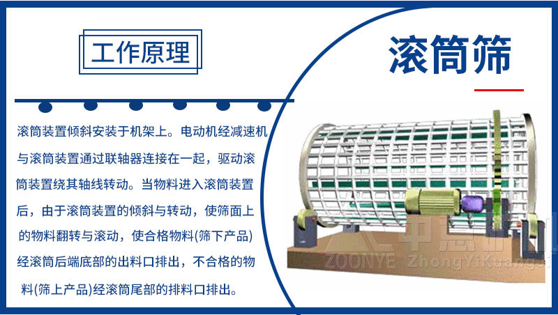 滾筒篩砂機(jī)、滾筒篩分機(jī)與滾筒篩的原理構(gòu)造幾乎相同,是人們對(duì)它的認(rèn)識(shí)和叫法上存在差異。由于物料在滾筒內(nèi)的翻轉(zhuǎn)、滾動(dòng),使卡在篩孔中的物料可被彈出,防止篩孔堵塞。滾筒篩主要由電機(jī)、減速機(jī)、滾筒裝置、機(jī)架、密封蓋、進(jìn)出料口組成。滾筒裝置傾斜安裝于機(jī)架上。電動(dòng)機(jī)經(jīng)減速機(jī)與滾筒裝置通過(guò)聯(lián)軸器連接在一起,驅(qū)動(dòng)滾筒裝置繞其軸線轉(zhuǎn)動(dòng)。當(dāng)物料進(jìn)入滾筒裝置后,由于滾筒裝置的傾斜與轉(zhuǎn)動(dòng),使篩面上的物料翻轉(zhuǎn)與滾動(dòng),使合格物料(篩下產(chǎn)品)經(jīng)滾筒外圓的篩網(wǎng)排出,不合格的物料(篩上產(chǎn)品)經(jīng)滾筒末端排出。由于物料在滾筒內(nèi)的翻轉(zhuǎn)、滾動(dòng),使卡在篩孔中的物料可被彈出,防止篩孔堵塞。