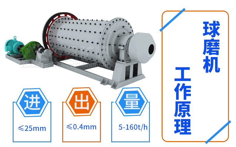 球磨機工作時,物料由進料裝置經入料中空軸螺旋均勻地進入磨機一倉,該倉內有階梯襯板或波紋襯板,內裝不同規格鋼球,筒體轉動產生離心力將鋼球帶到高度后落下,對物料產生重擊和研磨作用。物料在一倉達到粗磨后,經單層隔倉板進入二倉,該倉內鑲有平襯板,內有鋼球,將物料進一步研磨。粉狀物通過卸料箅板排出,完成粉磨作業。
