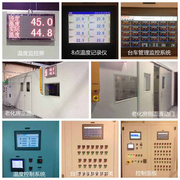 8.23、溫度顯示: a、10.2寸的觸摸屏顯示+2個22寸的LED顯示屏 b、老化總過程溫度自動控制 8.24、聲光報警系統:在老化房外設置設置蜂鳴器,音樂報警,指示老化房內運行狀態 8.25、產品老化過程及狀態監控 a、產品老化過程:當產品進入老化房產品上電后(每個插座設計獨立計時開關),操作人員按下計時器開關(狀態為開)開始計時,產品開始老化(此臺設備的老化進入計時狀態),老化時間到達,計時停止,外部控制面板相應的指示燈指示老化房老化完成。 b、老化狀態監控,在老化房內部線槽和老化房外部控制面板上,同步設計了產品老化的電源狀態指示燈(老化停止狀態、正在老化狀態) c、各個電源插座單獨計時的時序控制程序集成到控制觸摸屏內,增加獨立的PLC和計時控制切換的低壓電器控制箱。 |